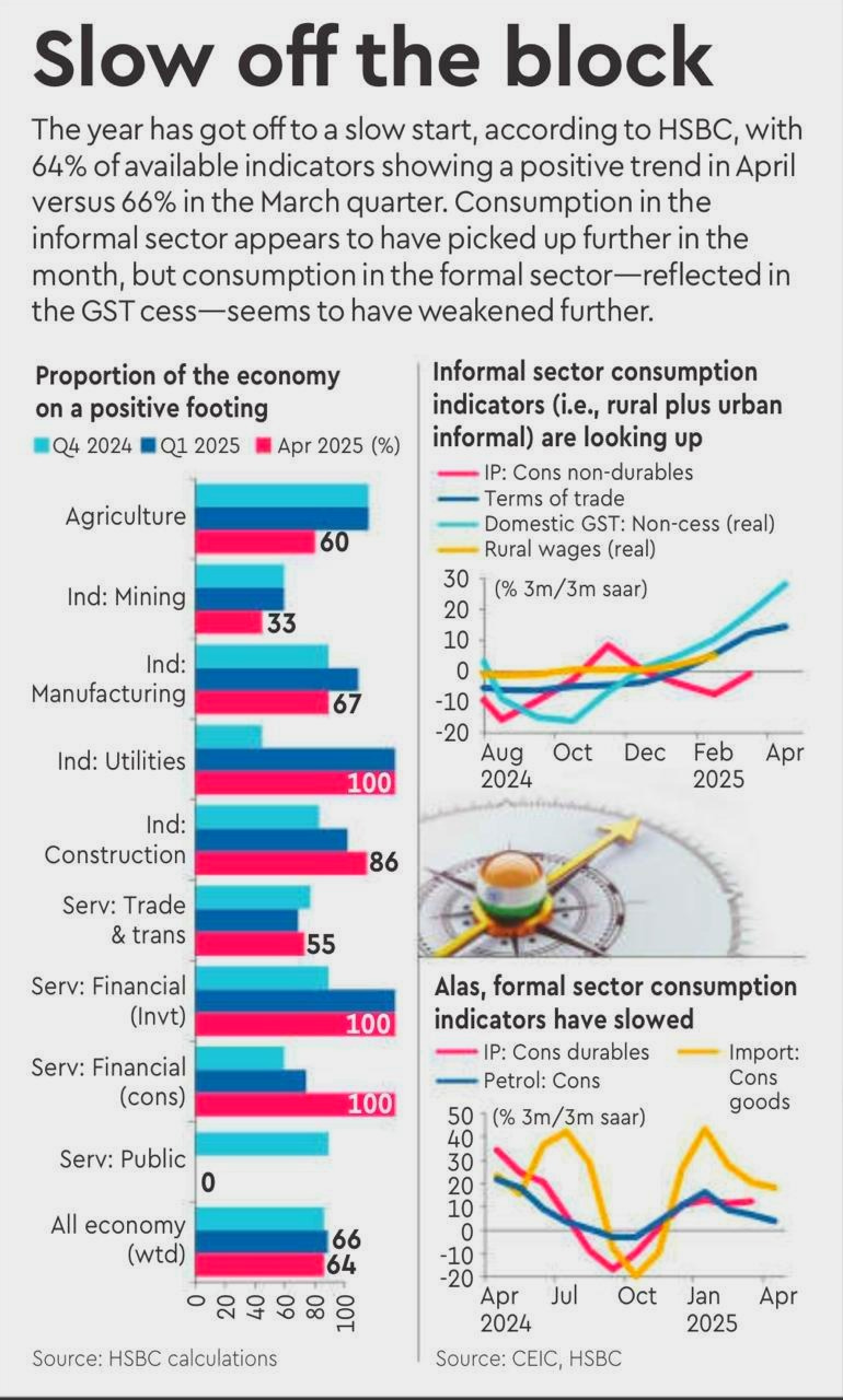 ‘फायनेंशियल एक्सप्रेस’ की खबर है कि भारतीय अर्थव्यवस्था फिलहाल एक संक्रमणकालीन दौर से गुजर रही है — जहां ग्रामीण और असंगठित क्षेत्र में सुधार की उम्मीद दिख रही है, वहीं शहरी और औपचारिक क्षेत्र की सुस्ती चिंता का विषय है. साल 2025 की शुरुआत भारतीय अर्थव्यवस्था के लिए अपेक्षा के अनुरूप तेज़ नहीं रही है. एचएसबीसी की हालिया रिपोर्ट के अनुसार, अप्रैल 2025 में केवल 64% आर्थिक संकेतकों ने सकारात्मक रुझान दिखाया, जबकि मार्च तिमाही में यह आंकड़ा 66% था. रिपोर्ट में बताया गया है कि गैर-औपचारिक क्षेत्र में खपत में सुधार देखा गया है, जबकि औपचारिक क्षेत्र में कमजोरी और सुस्ती बनी हुई है. रिपोर्ट में कहा गया है कि ग्रामीण और शहरी असंगठित क्षेत्रों की खपत में सुधार हुआ है. संकेतकों से यह स्पष्ट होता है कि गांवों और छोटे कस्बों में लोगों की क्रय शक्ति में वृद्धि हो रही है और खर्च बढ़ा है. इसके विपरीत, शहरी और संगठित क्षेत्रों में खपत में गिरावट दर्ज की गई है. विशेष रूप से जिन क्षेत्रों में कमजोरी देखी गई है, वे हैं टिकाऊ उपभोग वस्तुएं, पेट्रोलियम उत्पादों की खपत, आयातित उपभोग वस्तुएं. इसका मतलब यह है कि बड़े शहरों के उपभोक्ता खर्च करने से पहले ज़्यादा सोच-विचार कर रहे हैं. संभवतः महंगाई, ब्याज दरें या भविष्य की अनिश्चितताओं के कारण.