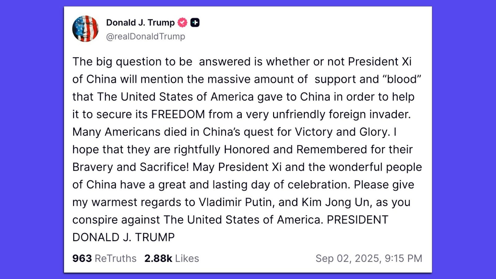 इस शक्ति प्रदर्शन पर अमेरिका से तत्काल और तीखी प्रतिक्रिया आई. पूर्व राष्ट्रपति डोनाल्ड ट्रंप ने अपने सोशल मीडिया प्लेटफॉर्म 'ट्रुथ सोशल' पर शी जिनपिंग पर तंज़ कसते हुए लिखा, "जब आप संयुक्त राज्य अमेरिका के ख़िलाफ़ साज़िश रच रहे हों, तो कृपया व्लादिमीर पुतिन और किम जोंग-उन को मेरी तरफ़ से हार्दिक शुभकामनाएँ दें." ट्रंप ने यह भी सवाल उठाया कि क्या शी अपने भाषण में उस "भारी समर्थन और खून" का ज़िक्र करेंगे जो अमेरिका ने दूसरे विश्व युद्ध के दौरान चीन को एक विदेशी आक्रमणकारी से बचाने के लिए दिया था. इस परेड से जुड़ा एक और अहम घटनाक्रम भारत के प्रधानमंत्री नरेंद्र मोदी की मौजूदगी थी. तियानजिन में हुए शंघाई सहयोग संगठन (SCO) शिखर सम्मेलन के दौरान मोदी, शी जिनपिंग और व्लादिमीर पुतिन के साथ हाथ में हाथ डाले नज़र आए. इस तस्वीर ने दुनिया भर के रणनीतिकारों का ध्यान खींचा. इस मुलाक़ात के दौरान शी ने मोदी से कहा कि "अब ड्रैगन (चीन) और हाथी (भारत) को एक साथ आने का समय है," जो यह दिखाता है कि चीन, अमेरिका के अहम सहयोगी भारत को भी अपने पाले में लाने की कोशिश कर रहा है.