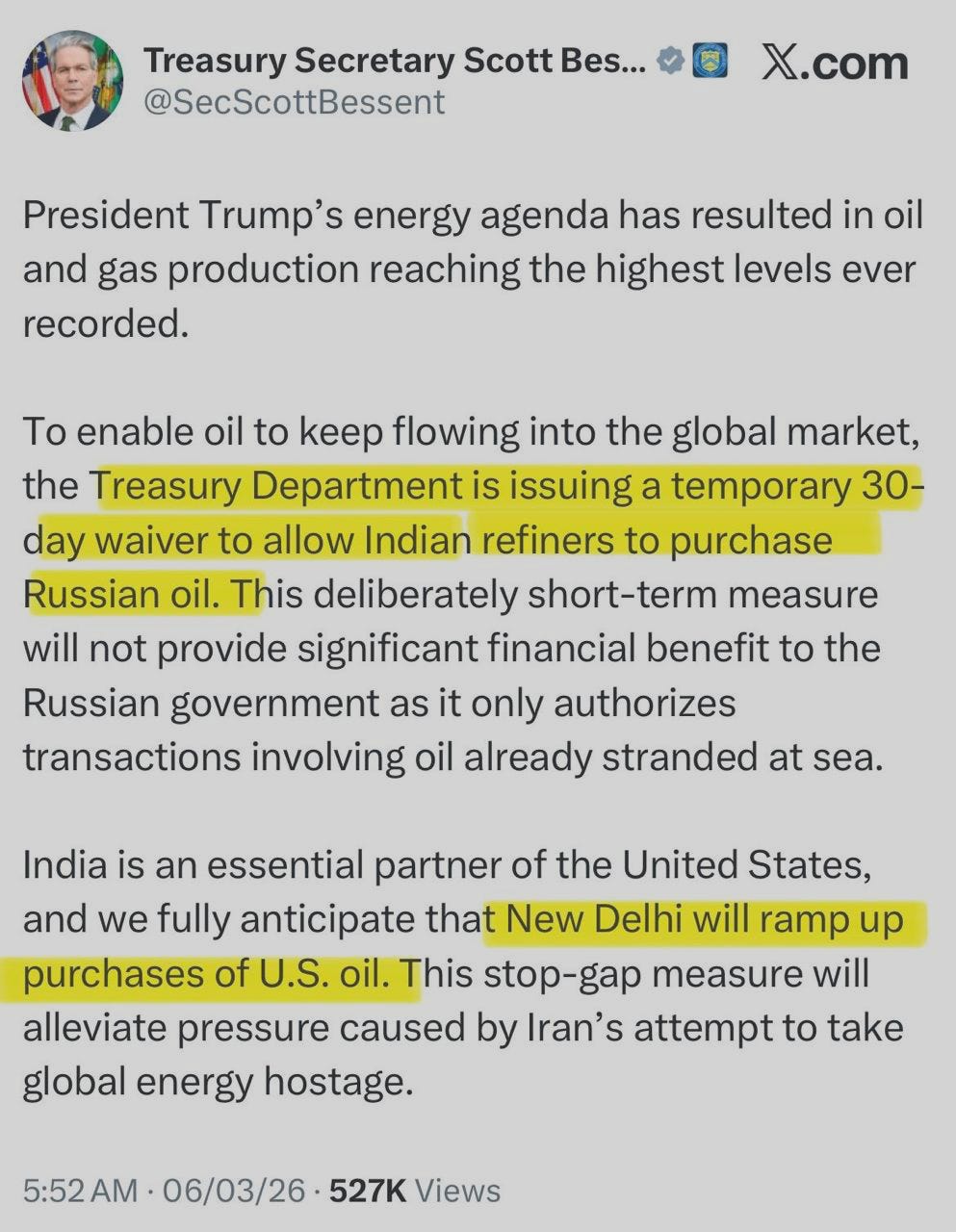 उज्वल जलाली की रिपोर्ट है कि बेसेन्ट ने कहा, “इससे रूसी सरकार को कोई सार्थक वित्तीय लाभ नहीं होगा, क्योंकि यह केवल उस तेल से जुड़े लेनदेन को अधिकृत करता है जो पहले से ही समुद्र में फंसा हुआ है.”