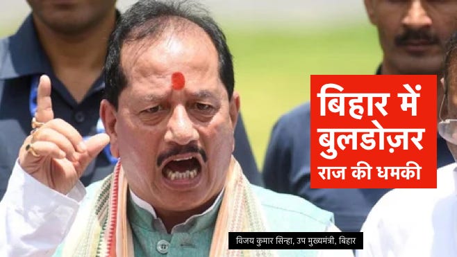 उत्तर प्रदेश के मुख्यमंत्री योगी आदित्यनाथ ने हाल ही में पुष्टि की थी कि अगर एनडीए बिहार में सत्ता में आती है तो बुलडोजर न्याय का “यूपी मॉडल” लागू किया जाएगा. यह टिप्पणी उन्होंने चल रहे चुनाव अभियान के हिस्से के रूप में बिहार के मुज़फ़्फ़रपुर में एक रैली को संबोधित करते हुए की थी. इस बीच, गुरुवार को पहले चरण के मतदान के दौरान, बिहार के उपमुख्यमंत्री और लखीसराय से भाजपा उम्मीदवार विजय कुमार सिन्हा ने कहा कि राष्ट्रीय जनता दल (आरजेडी) के “गुंडों” के ख़िलाफ़ बुलडोजर न्याय लागू किया जाएगा, जिन्होंने कथित तौर पर खोरियारी गांव की यात्रा के दौरान उनके काफिले पर हमला किया था.