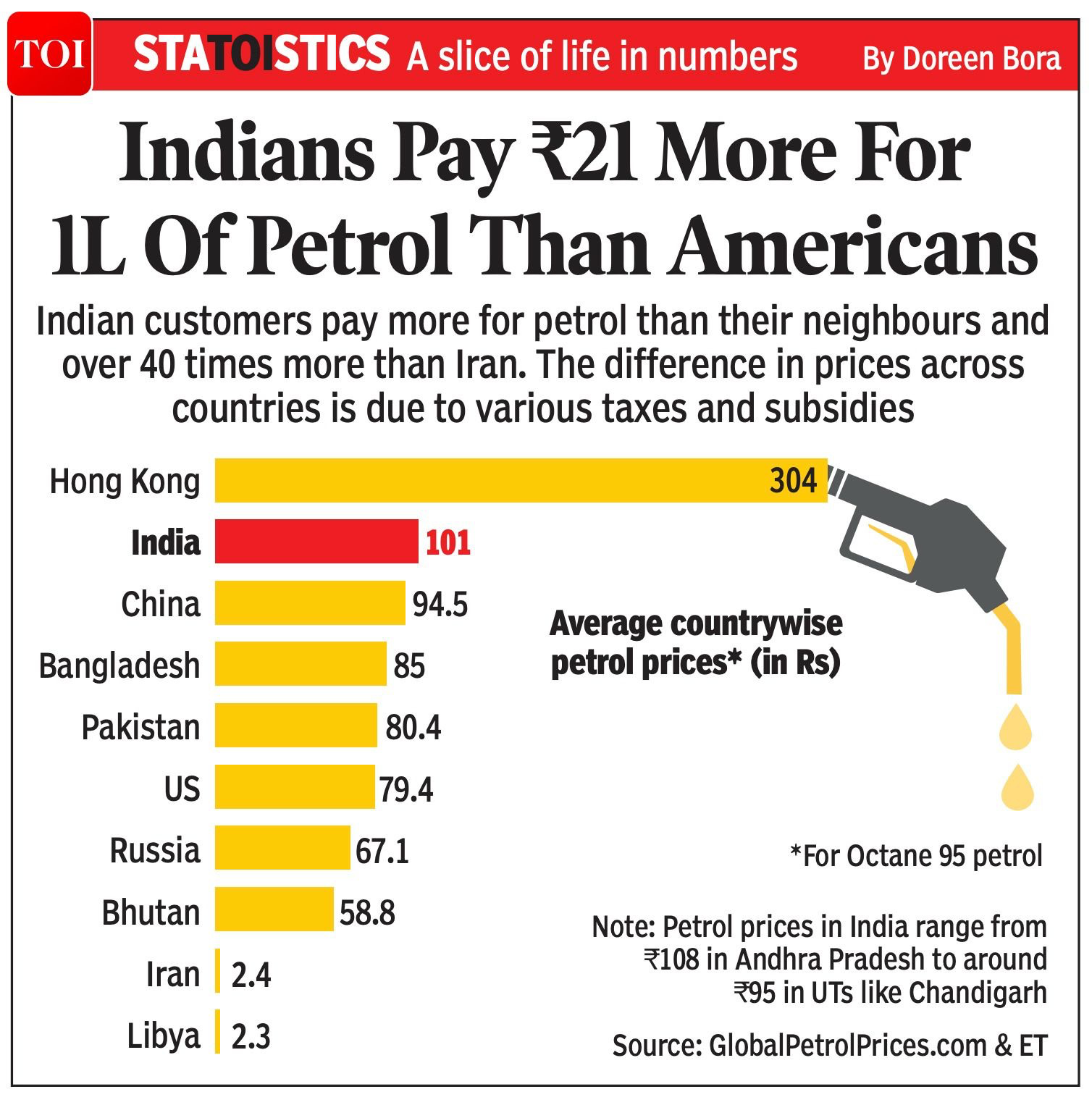 भारत में आम आदमी को एक लीटर पेट्रोल के लिए औसतन ₹101 खर्च करने पड़ते हैं, जो कि अमेरिका (₹79.4) से करीब ₹21.6 अधिक है. यह खुलासा डॉरीन बोरा की नई रिपोर्ट में हुआ है. भारत न सिर्फ अमेरिका बल्कि चीन (₹94.5), पाकिस्तान (₹80.4), रूस (₹67.1) और ईरान (सिर्फ ₹2.4) से भी महंगा पेट्रोल खरीद रहा है. डॉरीन बोरा के मुताबिक इन देशों में पेट्रोल की कीमतें टैक्स नीति और ऊर्जा सब्सिडी पर निर्भर हैं. भारत में टैक्स दरें ज़्यादा हैं, इसीलिए आम जनता को पेट्रोल के लिए जेब ढीली करनी पड़ती है. ‘द टाइम्स ऑफ इंडिया’ का ग्राफिक ये बताने को काफी है.