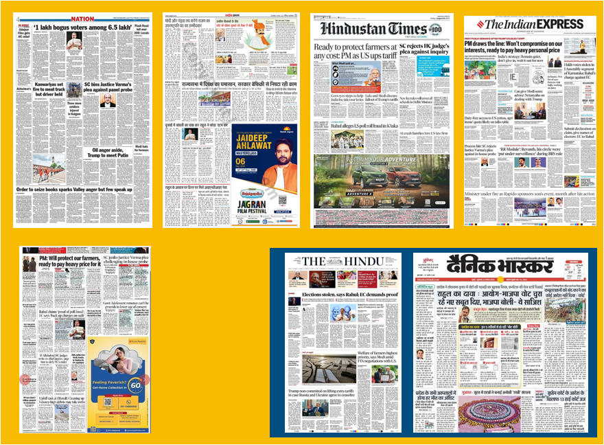 "हिंदुस्तान टाइम्स" ने पीएम के बढ़ते अमेरिकी शुल्कों के बीच किसानों की सुरक्षा पर दिए गए बयान को प्रमुखता दी. गांधी के 'मतदाता धोखाधड़ी' के आरोप को दो कॉलम की छोटी खबर और उसके साथ दो कॉलम की तस्वीर के रूप में प्रकाशित किया, जिसकी हेडलाइन थी—'राहुल ने कर्नाटक में लोकसभा मतदाता सूची में धोखाधड़ी का आरोप लगाया.'
