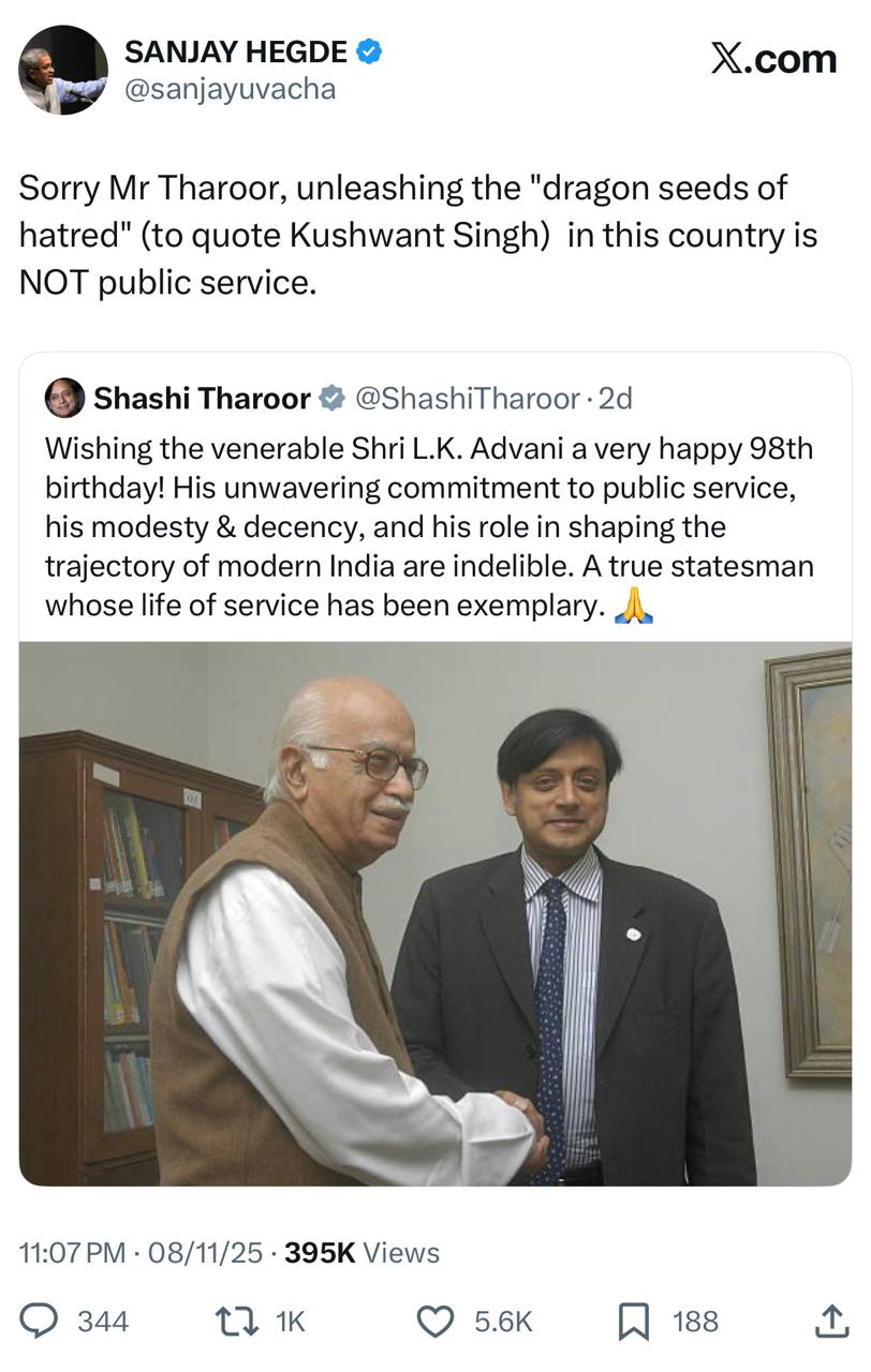 यह विवाद तब शुरू हुआ जब थरूर ने शनिवार को आडवाणी को उनके जन्मदिन पर शुभकामनाएं देते हुए उन्हें “एक सच्चे राजनेता कहा, जिनका सेवा जीवन अनुकरणीय रहा है.” इस पोस्ट को ऑनलाइन तुरंत प्रतिक्रिया मिली, आलोचकों ने थरूर पर विभाजनकारी राजनीति में आडवाणी की भूमिका को सफेदपोश करने का आरोप लगाया. वकील संजय हेगड़े ने राम जन्मभूमि आंदोलन में आडवाणी की भूमिका का अप्रत्यक्ष संदर्भ देते हुए कहा, “माफ़ करना, श्री थरूर, इस देश में नफरत के बीज (खुशवंत सिंह के हवाले से) बोना सार्वजनिक सेवा नहीं है.”