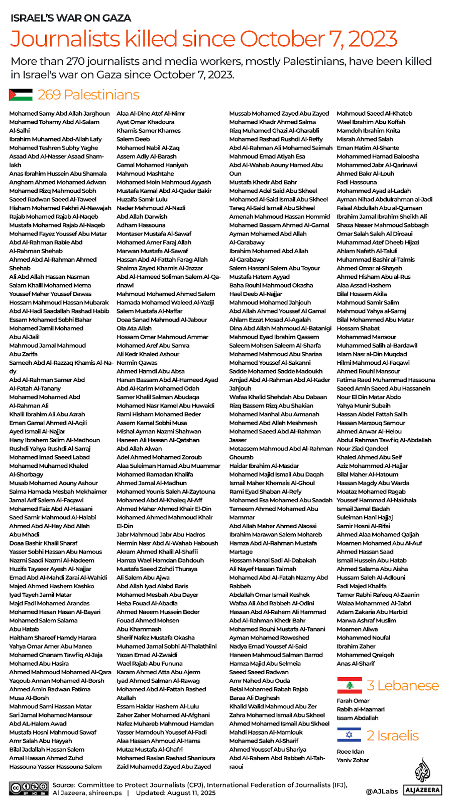 यह संघर्ष पत्रकारों के लिए अब तक का सबसे घातक रहा है. हमास द्वारा संचालित गाज़ा सरकारी मीडिया कार्यालय ने कहा है कि 7 अक्टूबर, 2023 को युद्ध शुरू होने के बाद से 238 पत्रकार मारे गए हैं. कमेटी टू प्रोटेक्ट जर्नलिस्ट्स (CPJ) के अनुसार, गाज़ा संघर्ष में कम से कम 186 पत्रकार मारे गए हैं. संयुक्त राष्ट्र की विशेष दूत इरीन ख़ान ने पिछले महीने कहा था कि अल शरीफ़ के ख़िलाफ़ इज़राइल के दावे निराधार थे. अल जज़ीरा ने बताया कि अल शरीफ़ ने अपनी मौत की स्थिति में पोस्ट करने के लिए एक संदेश छोड़ा था जिसमें लिखा था, "...मैंने सच्चाई को बिना किसी तोड़-मरोड़ के बताने में कभी संकोच नहीं किया, उम्मीद है कि ईश्वर उन लोगों का गवाह बनेगा जो चुप रहे".