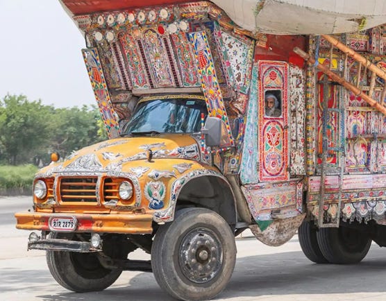 फोटोग्राफर क्रिस्टोफर हरविग ने दक्षिण एशिया में हज़ारों मील की यात्रा कर वहां के सजे-धजे वाहनों की तस्वीरें खींची हैं. उनकी नज़र से रंग-बिरंगे ट्रक, टैंकर और ऑटो-रिक्शा कुछ भी नहीं बचा है. इन पर बनी कलाकृतियां कई तरह की चीज़ों से प्रभावित हैं. जैसे पाकिस्तानी ट्रकों पर सिख गुरु, बांग्लादेशी ऑटो पर हवाई जहाज़ और समुद्री जहाज़, और यहां तक कि श्रीलंकाई ऑटो पर सिगरेट पीता हुआ 'द जोकर' भी नज़र आता है. जयपुर में, एक ट्रक पर बेटियों को शिक्षित करने का प्रेरक संदेश भी लिखा है.