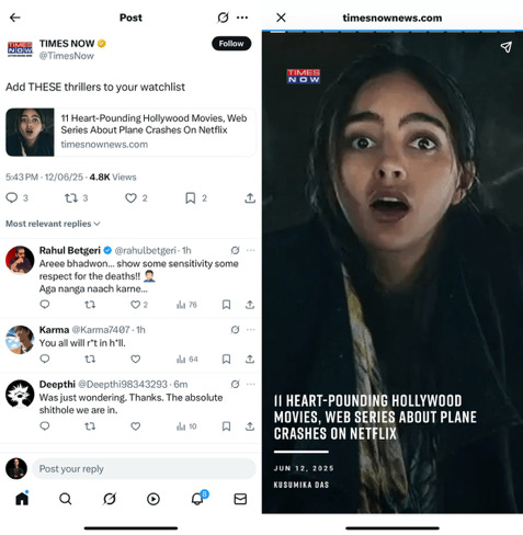 …और टाइम्स नाउ ने आज अव्वल दर्जे की बेवकूफाना होशियारी दिखाते हुए हवाई जहाज के भयानक हादसे के बाद प्लेन क्रैश से जुड़ी फिल्मों का लिस्टिकल छाप दिया. जिसे लेकर ‘बेस्ट ऑफ ट्राल’ हैंडल ने कहा, सीरियसली @timesnow? तुम्हें लगा कि यह प्लेन क्रैश से जुड़ी फिल्मों के लिस्टिकल छापने का सबसे माकूल मौका है? क्या तुम्हारे न्यूजरूम में एक भी वयस्क नहीं, जो इसे छापने से पहले बता पाता कि यह कितना वाहियात और खराब आइडिया है और खराब टाइमिंग भी.