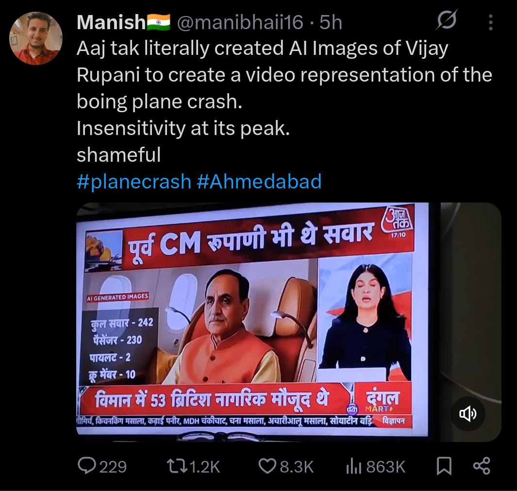 अहमदाबाद में हुए प्लेन क्रैश के बाद जब देश के नागरिक अपनी संवेदनाएं जता रहे थे, तब फिर से मुख्यधारा के मीडिया ने अपनी संवेदनहीनता का परिचय दिया है. 'आज तक' में अंजना ओम कश्यप के एक कार्यक्रम में हादसे की खबर के लिए एआई निर्मित एक वीडियो का इस्तेमाल किया गया, जिसमें मृतक विजय रूपाणी जो कि गुजरात के पूर्व मुख्यमंत्री भी रह चुके थे, उनकी छवि का इस्तेमाल किया गया. इस एआई निर्मित वीडियो को लेकर इंटरनेट बिरादरी में खासा रोष देखा गया और यूजर्स ने इसे चैनल की असंवेदनशीलता बताया.