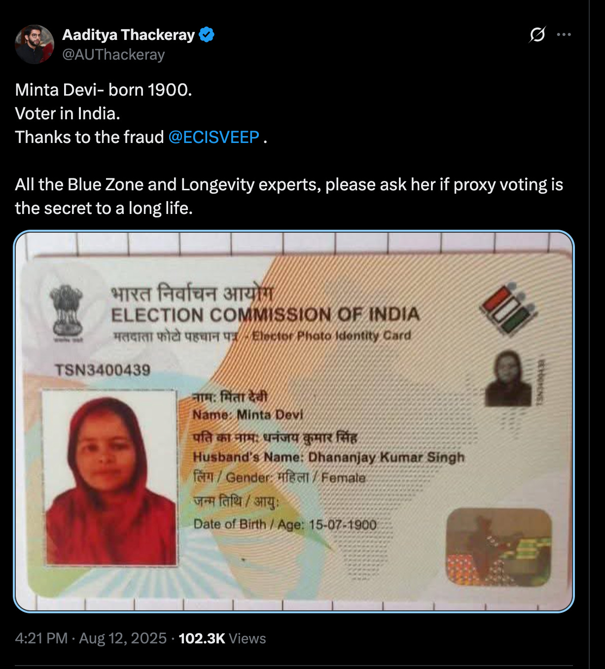 चुनाव आयोग द्वारा राज्य में होने वाले आगामी चुनावों से पहले मतदाता सूची के "एसआईआर" के तुरंत बाद, और राहुल गांधी द्वारा मतदाता सूची में हेराफेरी व धोखाधड़ी के सबूत बताए जाने वाली प्रस्तुति के बीच, मिंता देवी का नाम सामने आया है. कांग्रेस नेता पवन खेड़ा ने "एक्स" पर लिखा, "हम गर्व से मिंता देवी को गिनीज वर्ल्ड रिकॉर्ड के लिए नामांकित करते हैं: भारत में सबसे युवा दिखने वाली सबसे बुजुर्ग महिला – जो केंद्रीय चुनाव आयोग के कई चमत्कारों की देन है.
