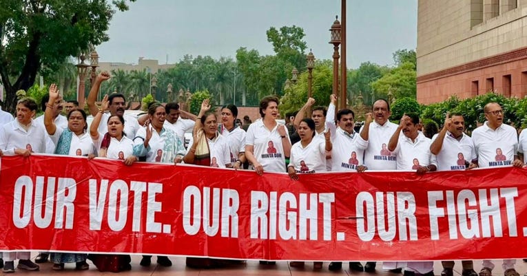 कांग्रेस सांसद के.सी. वेणुगोपाल ने कहा, "चुनाव आयोग ने मानवजाति की बड़ी सेवा की है. उन्होंने सबसे उम्रदराज जीवित व्यक्ति, मिंता देवी की खोज की है. चुनाव आयोग द्वारा की गई भारी मतदाता धोखाधड़ी कभी स्वीकार नहीं की जाएगी. "इंडिया" ब्लॉक तब तक विरोध करता रहेगा जब तक इसे रोका नहीं जाता." कांग्रेस सांसद माणिकम टैगोर ने कहा, "यह सिर्फ एक प्रशासनिक त्रुटि नहीं है - यह बड़े पैमाने पर मतदाता धोखाधड़ी का सबूत है. संसद में विरोध प्रदर्शन के दौरान मिंता देवी के बारे में पूछे जाने पर राहुल ने जवाब दिया: "पिक्चर अभी बाकी है."