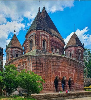 सैम डेलरिम्पल का अपने सब्सटैक पेज पर यह कहना है कि जब मैंने बांग्लादेश में ठीक से यात्रा करना शुरू नहीं किया था, तब मुझे इस बात का कोई अहसास नहीं था कि यहाँ की स्थापत्य विरासत कितनी समृद्ध, सुंदर और दुखद रूप से असुरक्षित है. लेकिन गाद भरी नदियों और चावल के अंतहीन खेतों के नीचे एक ऐसी भूमि छुपी है जो भुला दिए गए मस्जिदों, ध्वस्त होते मंदिरों, आधे डूबे स्तूपों और बोगनवेलिया से ढके महलों से भरी पड़ी है. इस उदासीन खंडहरों की दुनिया को मंदिर नगर पुठिया से बेहतर कोई जगह नहीं दर्शाती. राजशाही से थोड़ी दूरी पर, पद्मा नदी के पास स्थित, यह बांग्लादेश का सबसे बड़ा मंदिर नगर है. इस शांत और काफी हद तक भुला दिए गए नगर में देश की हिंदू विरासत का सबसे बड़ा केंद्र मौजूद है.सैम कहते हैं कि आज के राजनेता मुगल विजयों को धर्म प्रेरित जिहाद के रूप में चित्रित करते हैं, जिसमें मंदिरों को गिराकर उनकी जगह मस्जिदें बनाई गईं. पुठिया का मंदिर नगर इस तस्वीर को कुछ हद तक गड़बड़ा देता है. पहली बात यह कि उस समय मुगलों का प्रमुख सेनापति एक हिंदू था - मान सिंह. जब सिंह ने शाही मुगल सेनाओं के साथ उत्तर पश्चिम बंगाल पर आक्रमण किया, तो निशाना प्रांत के हिंदुओं पर नहीं, बल्कि दुश्मन बंगाल सल्तनत के मुस्लिम शासकों पर था. वास्तव में मुगल चाहते थे कि उन्हें सभी धर्मों के बंगालियों को सल्तनत के शासन से मुक्त कराने वाले के रूप में देखा जाए. पुठिया में, मान सिंह ने एक विद्रोही मुस्लिम पठान रईस की जमीनें जब्त कीं और उन्हें भट्टाचार्य नामक एक हिंदू संत को दे दीं, जिनकी स्थानीय जानकारी युद्ध में महत्वपूर्ण साबित हुई थी. भट्टाचार्य एक संत थे और उन्होंने भूमि अनुदान लेने से मना कर दिया, लेकिन उनके पुत्र ने उनकी ओर से इसे स्वीकार कर लिया. एक पीढ़ी बाद, सम्राट जहांगीर ने उनकी वफादारी और समर्थन के लिए धन्यवाद स्वरूप इस परिवार को 'राजा' की उपाधि से नवाजा. इस तरह पुठिया राजाओं का जन्म हुआ. अगली दो सदियों में, पुठिया राजाओं ने अपनी जागीर को कई टेराकोटा मंदिरों से सजाया. इनमें से शायद सबसे महान है पंच रत्न गोविंद मंदिर. पूरी तरह से टेराकोटा से बना यह मंदिर महाभारत और रामायण से लेकर गीत गोविंद तक विभिन्न महाकाव्यों की विस्तृत नक्काशी दर्शाता है, और कभी-कभार शाहनामे की कहानियां भी.