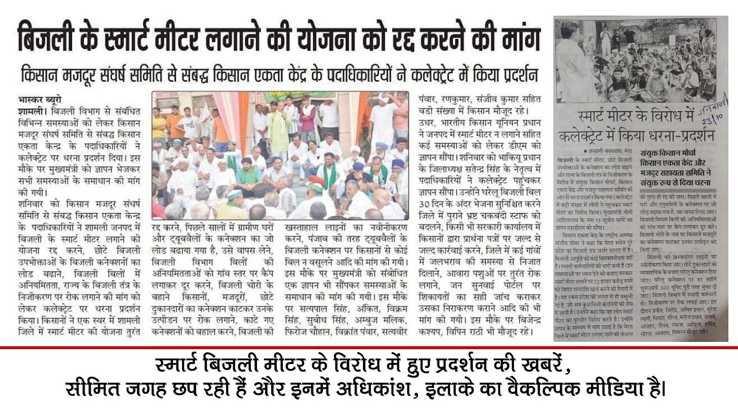 उत्तर प्रदेश में स्मार्ट बिजली मीटर के खिलाफ किसानों और मजदूरों का संयुक्त विरोध बड़ा आकार ले रहा है. 'संयुक्त किसान मोर्चा' से जुड़े किसान संगठन ‘किसान एकता केंद्र’ के बैनर तले हाल ही में किसानों ने पश्चिमी उत्तर प्रदेश के 3 जिलों मेरठ, बागपत और शामली में बड़ा प्रदर्शन किया था, जिसमें हजारों किसान शामिल हुए. ये ख़बरें स्थानीय मीडिया मसलन ‘जनवाणी’ ने तो प्रकाशित की, लेकिन इलाके के बड़े अख़बारों ने इसे जगह नहीं दी. स्मार्ट बिजली मीटरों का सम्बन्ध अडानी की कंपनी से जुड़ा है और इस स्मार्ट मीटर योजना के खिलाफ यूपी, बिहार, उत्तराखंड और महाराष्ट्र समेत कई जगहों पर विरोध हो चुका है. हमने ‘हरकारा’ के 13 नवम्बर के अंक पर इस पर एक विस्तृत रिपोर्ट पूर्व में की है.
