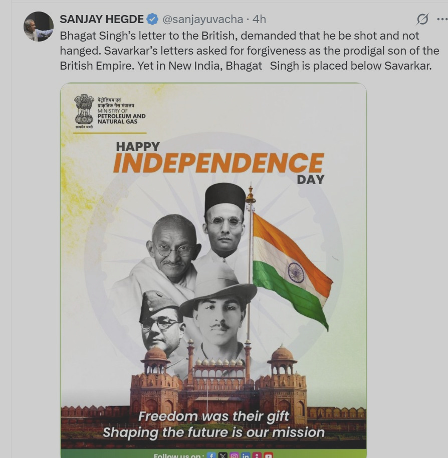 सुप्रीम कोर्ट के वरिष्ठ वकील और नागरिक अधिकारों के लिए मुखर आवाज़ संजय हेगड़े ने "एक्स" पर अपनी पोस्ट में लिखा, "भगत सिंह ने अंग्रेज़ों को लिखे अपने पत्र में मांग की थी कि उन्हें फांसी न दी जाए, बल्कि गोली मारकर मौत दी जाए. सावरकर ने अपने पत्रों में ब्रिटिश साम्राज्य का ‘भटका हुआ पुत्र’ बनकर क्षमा याचना की थी. फिर भी "नए भारत" में भगत सिंह को सावरकर से नीचे स्थान दिया जाता है."