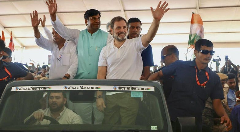 लोकसभा में विपक्ष के नेता राहुल गांधी ने रविवार को चुनाव आयोग पर ज़ोरदार हमला बोलते हुए आरोप लगाया कि मोदी सरकार ने 2023 में एक कानून पास किया है, ताकि चुनाव आयोग के खिलाफ कोई कार्रवाई न हो सके. क्योंकि चुनाव आयोग भाजपा की मदद कर रहा है और उनके साथ "वोट चोरी" में संलिप्त है. उन्होंने सासाराम से आज शुरू हुई अपनी 'वोटर अधिकार यात्रा' के पहले दिन के अंत में औरंगाबाद में कहा कि जब उनसे "वोट चोरी" के खुलासे के बाद हलफनामा देने को कहा गया, तो भाजपा नेताओं से ऐसी कोई मांग नहीं की गई, जिन्होंने अपने प्रेस कॉन्फ्रेंस में इसी प्रकार के आरोप लगाए थे.