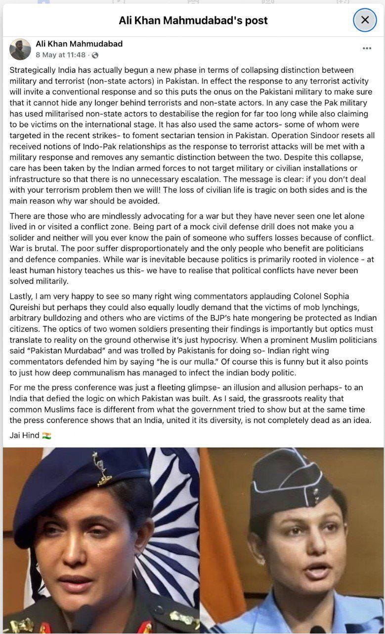 विवाद की शुरुआत प्रोफेसर महमूदाबाद की 8 मई की फेसबुक पोस्ट से हुई थी, जिसमें उन्होंने सशस्त्र बलों में महिला अधिकारियों की दक्षिणपंथी प्रशंसा में ‘पाखंड’ की ओर इशारा किया था, जबकि वे घृणा अपराधों और व्यवस्थागत अन्यायों पर चुप रहते हैं. उन्होंने लिखा था, "मैं बहुत खुश हूं कि इतने सारे दक्षिणपंथी टिप्पणीकार कर्नल सोफिया कुरैशी की सराहना कर रहे हैं, लेकिन शायद वे उतनी ही जोर से यह भी मांग कर सकते हैं कि मॉब लिंचिंग, मनमाने ढंग से बुलडोजर चलाने और भाजपा की नफरत फैलाने वाली राजनीति के शिकार अन्य लोगों को भारतीय नागरिकों के रूप में संरक्षित किया जाए. दो महिला सैनिकों द्वारा अपने निष्कर्ष प्रस्तुत करने की छवि महत्वपूर्ण है, लेकिन छवि को जमीन पर वास्तविकता में बदलना होगा, अन्यथा यह सिर्फ पाखंड है."
