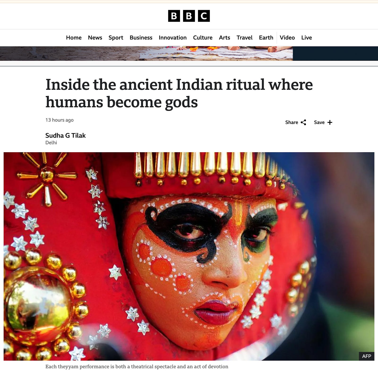 बीबीसी' के लिए सुधा जी तिलक ने एक स्टोरी की है, जिसमें उन्होंने प्राचीन भारतीय अनुष्ठान के अंदर जहां मनुष्य देवता बन जाते हैं, उस तहखाने की कहानी पेश की है. थेय्यम की कहानी, जो उत्तर केरल का एक प्रमुख अनुष्ठान है. सुधा ने लिखा है लगभग 300 वर्षों से भारत के दक्षिणी राज्य केरल में एक परिवार का पैतृक घर एक प्राचीन लोक अनुष्ठान थेय्यम का मंच रहा है. केरल और पड़ोसी कर्नाटक के कुछ हिस्सों में मुख्य रूप से पुरुष कलाकार पारंपरिक वेशभूषा, चेहरे के रंग और ट्रान्स-जैसे नृत्य, माइम और संगीत के माध्यम से देवताओं को अवतरित करते हैं. हर साल केरल भर में पारिवारिक संपत्तियों और मंदिरों के पास के स्थानों में लगभग एक हजार थेय्यम प्रदर्शन होते हैं, जो पारंपरिक रूप से हाशिए की जातियों और आदिवासी समुदायों के पुरुषों द्वारा किया जाता है. अब इसी थेय्यम पर इतिहासकार केके गोपालकृष्णन ने थेय्यम की मेजबानी में अपने परिवार की विरासत और अनुष्ठान की जीवंत परंपराओं का जश्न एक नई किताब, 'थेय्यम: एन इनसाइडर्स विजन' में मनाया है. केरल में थेय्यम का मौसम आम तौर पर अक्टूबर से अप्रैल तक चलता है, जो मानसून के बाद और सर्दियों के महीनों के साथ मेल खाता है.