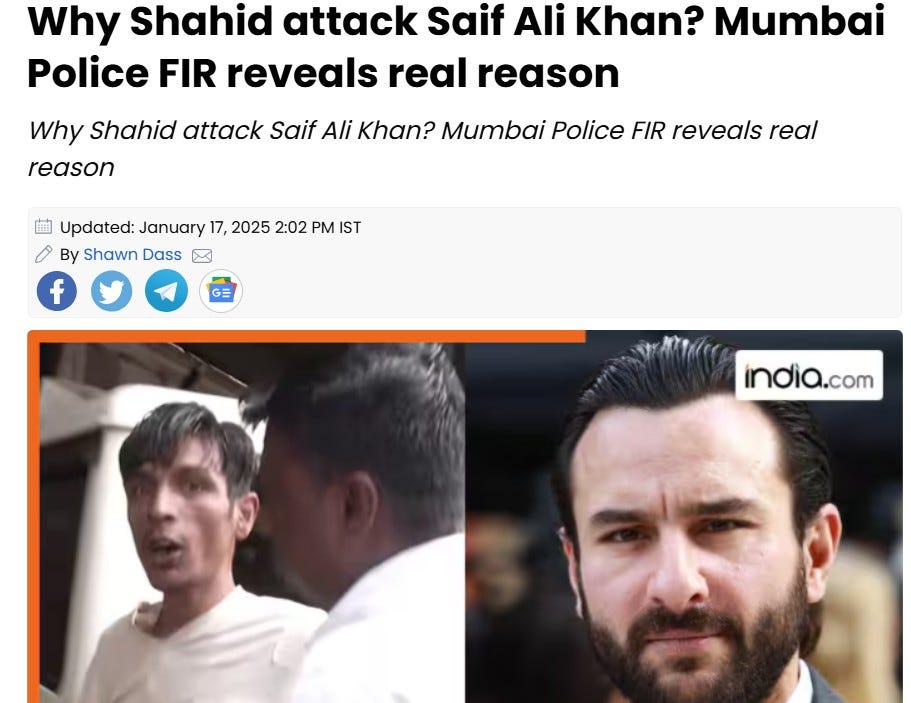 17 जनवरी को ‘इंडिया डॉट कॉम’ (अन्य मीडिया ने भी) ने एक खबर चलाई थी. रिपोर्ट में सैफ पर हमला करने वाले का नाम शाहिद बताया था. बजाब्ते उस खबर में शाहिद के आपराधिक रिकॉर्ड के बारे में भी बताया गया था. यह भी लिखा गया था कि जल्द ही कोई बड़ा खुलासा होने वाला है. हमलावर की तस्वीर भी उसने जारी की थी (देखें स्क्रीन शॉट). रिपोर्ट के अनुसार, पुलिस ने हमले में इस्तेमाल चाकू भी बरामद कर लिया था.