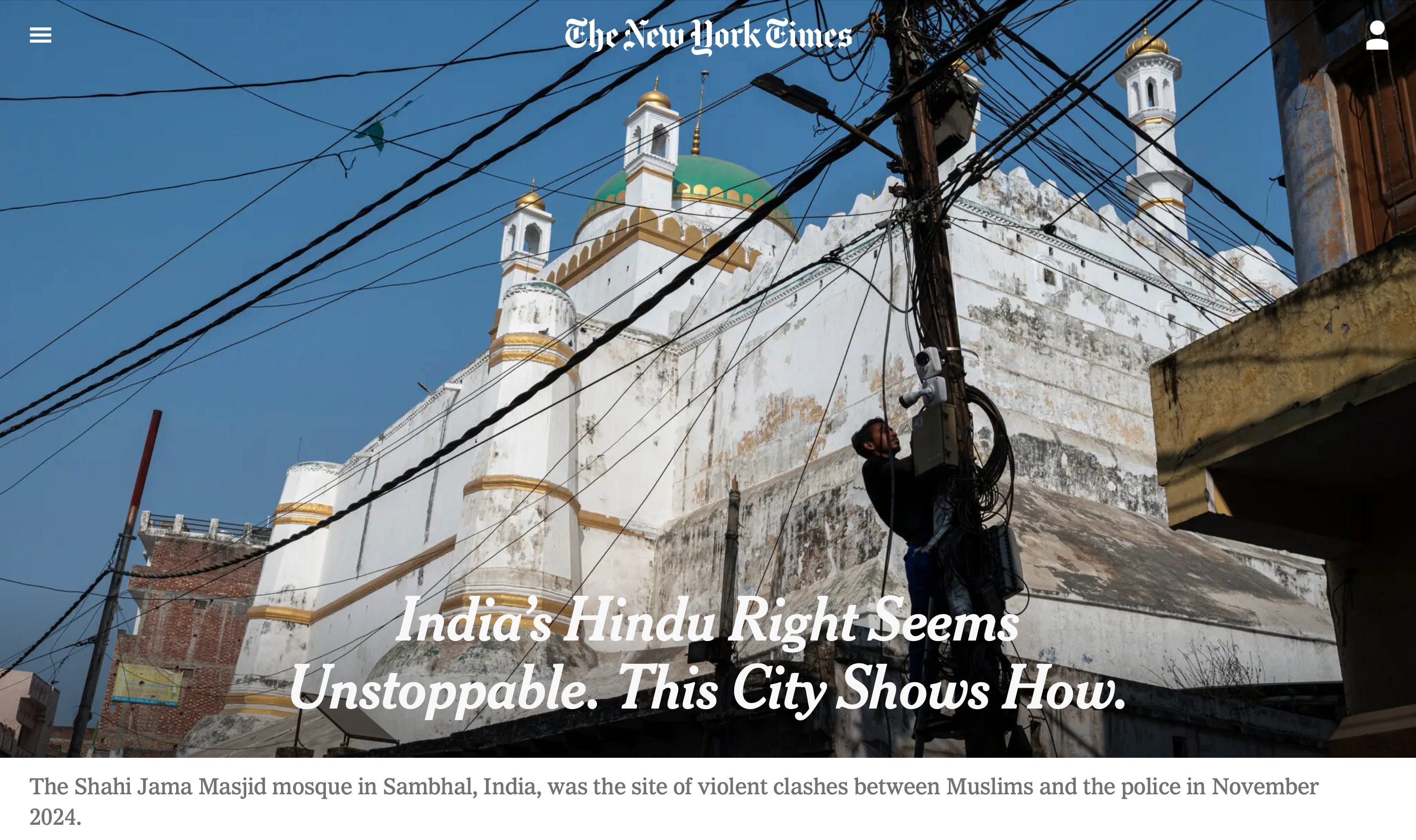 न्यूयॉर्क टाइम्स के रिपोर्टर मुजीब मशाल और सुहासिनी राज ने यूपी के सम्भल, जिसे हिंदू दक्षिणपंथ (हिंदू राइट) की बढ़ती ताकत का नया केंद्र माना जा रहा है, का दौरा करने के बाद एक विस्तृत रिपोर्ट दी है. नवंबर 2024 में 16वीं शताब्दी की शाही जामा मस्जिद को लेकर हुए विवाद और उसके बाद हुई हिंसक झड़पों ने शहर को बदल दिया है. रिपोर्ट के मुताबिक, हिंदू राष्ट्रवादियों ने दावा किया कि मस्जिद एक पवित्र हिंदू स्थल पर बनाई गई थी और इसे अदालतों के माध्यम से चुनौती दी.