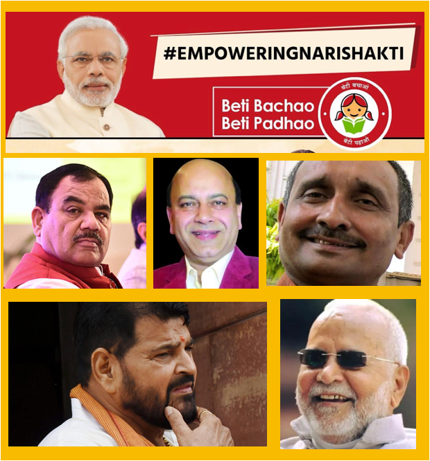 चाल, चरित्र, चेहरा जैसे अनुप्रास अलंकारों का प्रयोग भारतीय जनता पार्टी को खासा भाता है और संस्कार की बात करते राष्ट्रीय स्वयंसेवक संघ थकता नहीं. कर्नाटक में भाजपा विधायक द्वारा बलात्कार और दूसरे जघन्य अपराधों के बाद ‘टीम हरकारा’ ने 2014 से अब तक उन भाजपा नेताओं की लिस्ट बनाई है, जिन पर बलात्कार, यौन शोषण, और इससे संबंधित गंभीर अपराधों के आरोप लगे हैं. इनमें सांसद, विधायक, और पूर्व मंत्री जैसे महत्वपूर्ण पदों पर आसीन व्यक्ति शामिल हैं. पार्टी की प्रतिक्रिया इन मामलों में भिन्न रही है; कुछ हाई-प्रोफाइल मामलों में निलंबन और निष्कासन जैसे कदम उठाए गए हैं.