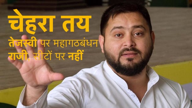 तेजस्वी पर महागठबंधन राजी, सीटों पर नहीं कई दिनों की बातचीत के बाद, कांग्रेस ने गुरुवार को आखिरकार राजद (आरजेडी) नेता तेजस्वी यादव को महागठबंधन के मुख्यमंत्री पद का चेहरा घोषित कर दिया. इसके अतिरिक्त, विकासशील इंसान पार्टी (वीआईपी) के प्रमुख मुकेश सहनी को गठबंधन के उपमुख्यमंत्री पद का चेहरा घोषित किया गया, जिसमें कांग्रेस नेता अशोक गहलोत ने कहा कि वे चुनावों के बाद उपमुख्यमंत्री पद के लिए अन्य नामों पर भी विचार कर सकते हैं.