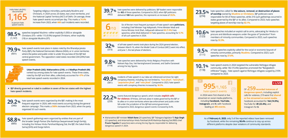 274 भाषणों में अल्पसंख्यक पूजा स्थलों को हटाने या ध्वस्त करने का आह्वान किया गया. सोशल मीडिया प्लेटफॉर्म्स, विशेषकर फेसबुक और यूट्यूब, इस घृणा के प्रसार में महत्वपूर्ण भूमिका निभाते रहे. 995 घटनाओं को उनके मूल स्रोत तक ट्रेस किया गया.