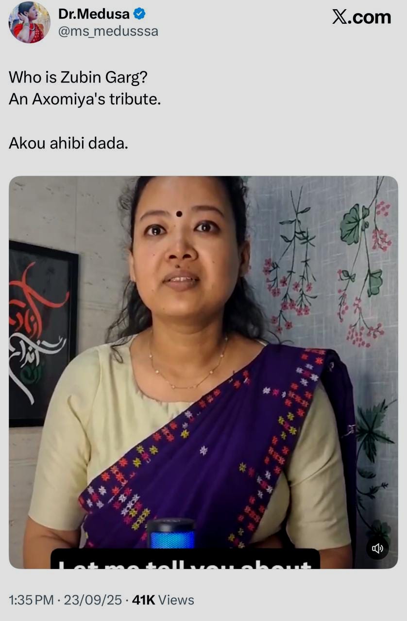 आंसुओं से भरी हुई.. पर बोलती हुई.. डॉ मेडुसा ने एक वीडियो जारी किया है अपने प्यारे गायक जुबीन गर्ग के बारे में, उनके महत्व के बारे में.. उनके जाने के बारे मे. यह हिंदी में उसका अनुवाद
