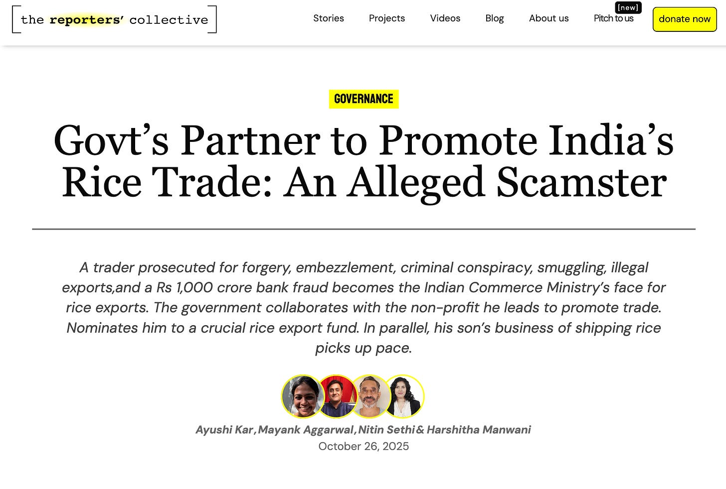 द रिपोर्टर्स कलेक्टिव के लिए किये गये इस एक्सपोजे में आयुषी कर, नितिन सेठी, मयंक अग्रवाल और हर्षिता मनवानी ने पाया कि यह नई गैर-लाभकारी कंपनी अगस्त 2023 में गर्ग ने छह अन्य कंपनियों के साथ मिलकर पंजीकृत की थी, जिनके बोर्ड में उनके रिश्तेदार (उनके बेटे सहित) और पुराने सहयोगी शामिल हैं. गर्ग की जिस संस्था, इंडियन राइस एक्सपोर्टर्स फेडरेशन (IREF) के साथ वाणिज्य और उद्योग मंत्रालय ने साझेदारी की है, उसे मंत्रालय इवेंट वेबसाइट पर “बासमती और गैर-बासमती चावल निर्यातकों के हितों का प्रतिनिधित्व करने वाला एक राष्ट्रीय स्तर का शीर्ष निकाय” बताता है.