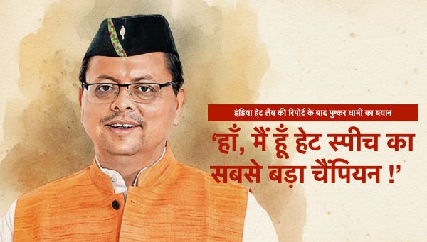 उत्तराखंड के मुख्यमंत्री पुष्कर सिंह धामी ने ‘इंडिया हेट लैब’ की एक रिपोर्ट में साल 2025 का सबसे बड़ा ‘हेट-स्पीच एक्टर’ (नफरती भाषण देने वाला) नामित किए जाने के बाद कहा कि वह इस “टैग को स्वीकार करते हैं.” उन्होंने तर्क दिया कि यदि उन मुद्दों को उठाना, जिन्हें वे “उत्तराखंड के भविष्य के लिए खतरा” मानते हैं, नफरत भरा भाषण कहलाता है, तो वे इसे स्वीकार करने के लिए तैयार हैं.