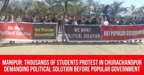 मणिपुर के चुराचांदपुर जिले में बुधवार को हजारों छात्रों ने राज्य में एक लोकप्रिय सरकार (लोकतांत्रिक सरकार) बनाने के प्रयासों के खिलाफ विरोध प्रदर्शन करने और कुकी-ज़ो समुदाय के लिए “राजनीतिक समाधान” की मांग पर जोर देने के लिए मार्च निकाला. चुराचांदपुर के ‘जॉइंट स्टूडेंट्स’ द्वारा निकाला गया यह जुलूस जिला मुख्यालय के लामका पब्लिक ग्राउंड से शुरू हुआ और तुइबोंग में समाप्त हुआ. 2 किलोमीटर की दूरी तय करते हुए प्रदर्शनकारियों ने “राजनीतिक समाधान चाहिए, लोकप्रिय सरकार नहीं” की आवश्यकता पर नारे लगाए.