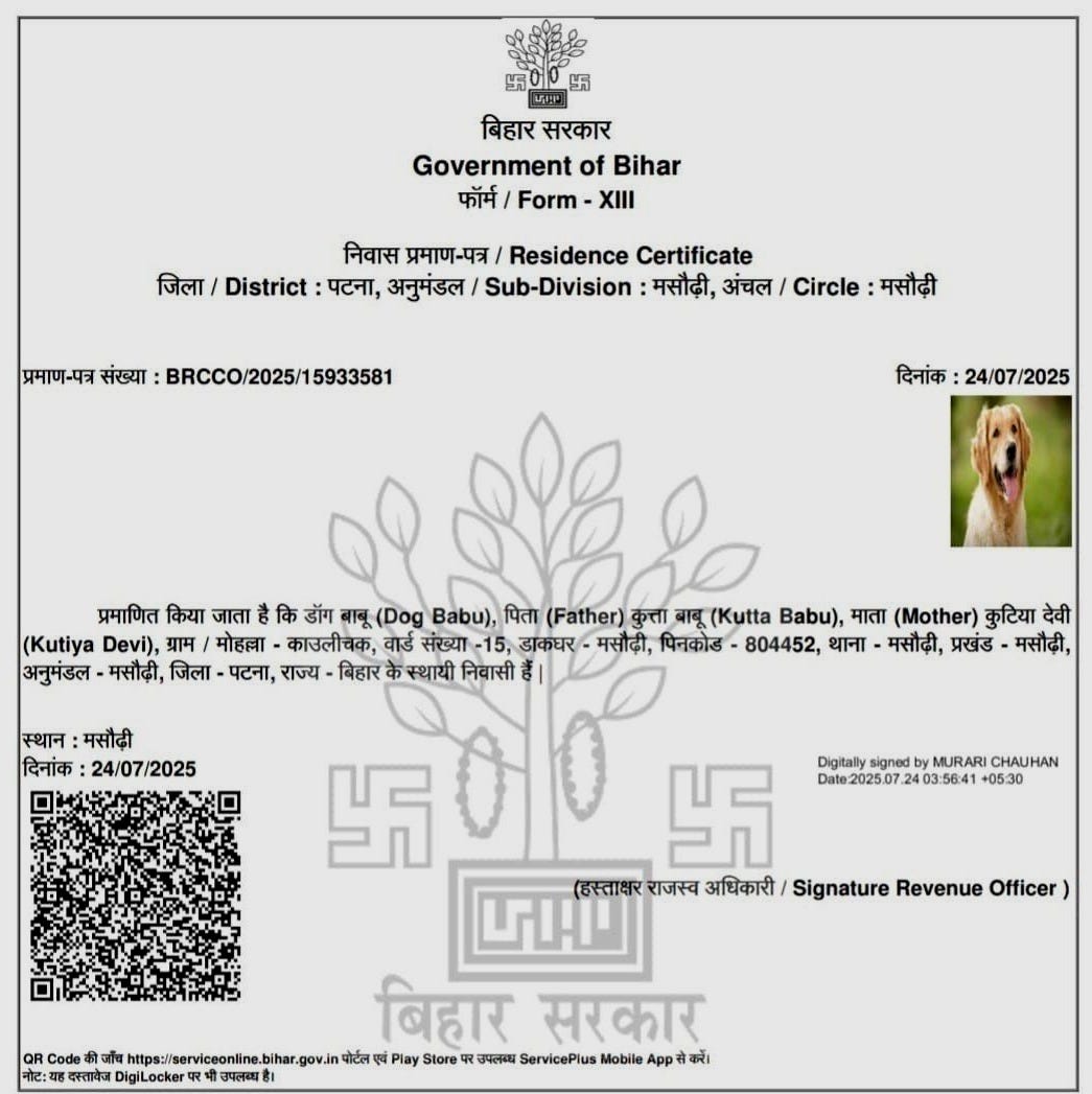 कुत्ते के नाम से जारी हुआ आवास प्रमाण पत्र