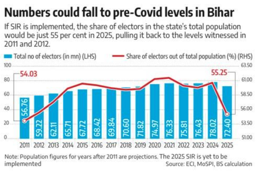 वहीं दूसरी ओर, चुनाव आयोग के एक कदम से राज्य में मतदाताओं की संख्या में ऐतिहासिक गिरावट की आशंका पैदा हो गई है. आयोग ने 24 अगस्त को बताया कि मतदाता सूची के विशेष गहन पुनरीक्षण (SIR) के तहत 98% मतदाताओं ने अपने दस्तावेज़ जमा कर दिए हैं. लेकिन बिजनेस स्टैंडर्ड की रिपोर्ट के अनुसार, अगर जुलाई 2025 में यह संशोधित सूची लागू होती है, तो मतदाताओं की संख्या 2024 के 7.8 करोड़ से घटकर कोविड से पहले के स्तर से भी नीचे जा सकती है. इसके लागू होने पर राज्य की कुल आबादी में मतदाताओं का हिस्सा गिरकर लगभग 55% रह जाएगा, जो 2011-12 के बाद का सबसे निचला स्तर होगा. यह हाल के वर्षों में मतदाताओं की संख्या में सबसे तेज गिरावट होगी, जिसने नागरिक समाज और राजनीतिक दलों के बीच चिंता बढ़ा दी है.