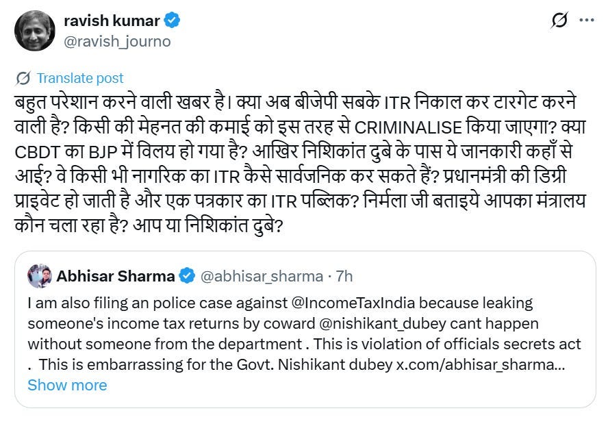 इसी दिन भाजपा सांसद निशिकांत दुबे ने “एक्स” पर एक कथित आयकर रिटर्न (आईटीआर) दस्तावेज़ साझा कर दावा किया कि एक पत्रकार की आय में भारी वृद्धि हुई है, जबसे उसने नौकरी छोड़कर “मोदी और भाजपा को गाली देना शुरू किया.” यह पत्रकार कौन है? यह उन्होंने अपने अनुयायियों पर छोड़ दिया.