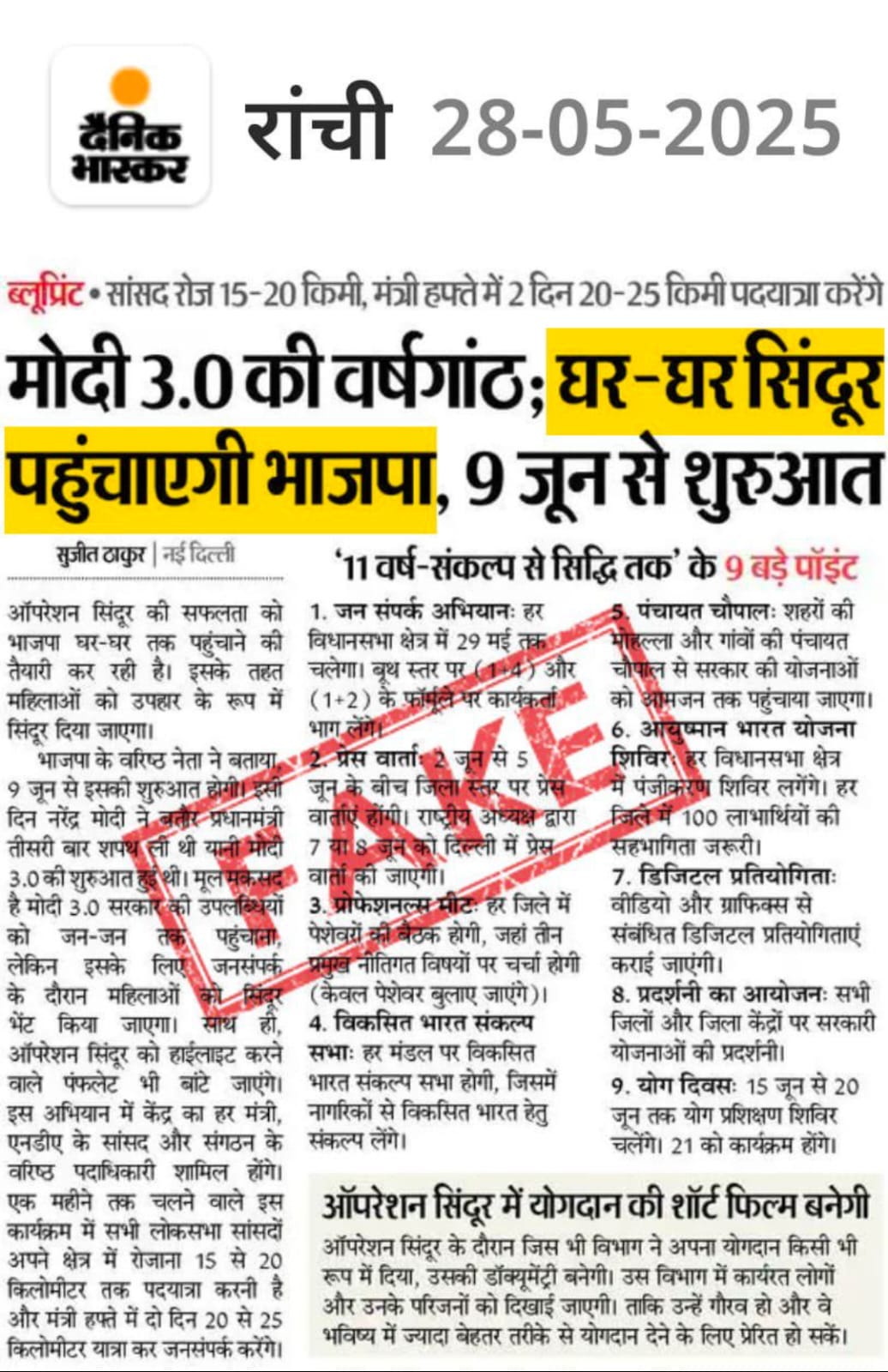घर-घर सिंदूर को लेकर भाजपा बैकफुट पर, भास्कर में प्रकाशित ख़बर को फेक बताया