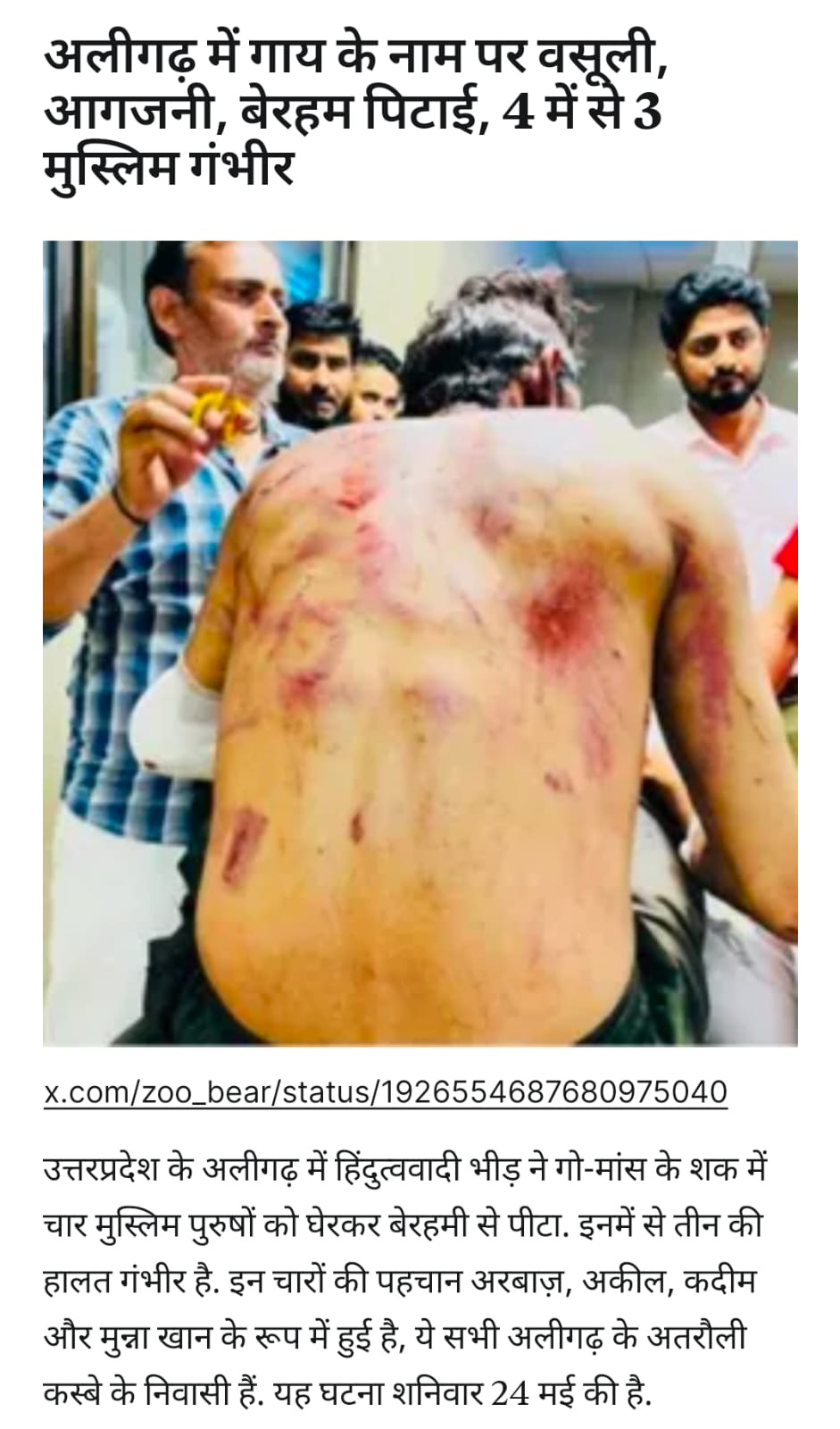 उत्तर प्रदेश के अलीगढ़ में गोमांस की तस्करी के आरोप में हिंदुत्व संगठनों के सदस्यों के चार मुस्लिम व्यक्तियों को घेरकर हमला करने के कुछ दिनों बाद, पुलिस सूत्रों ने ‘द वायर’ को बताया है कि वास्तव में ‘गाय का मांस’ नहीं था. हरदुआगंज पुलिस स्टेशन के स्टेशन हाउस ऑफिसर (एसएचओ) धीरज कुमार ने पुष्टि की है कि फोरेंसिक रिपोर्ट ने गोमांस तस्करी के आरोपों को खारिज कर दिया है. नमूनों को परीक्षण के लिए मथुरा की एक सरकारी प्रयोगशाला में भेजा गया था. अलीगढ़ पुलिस ने भी गोमांस तस्करी के आरोपों को झूठा बताया है.