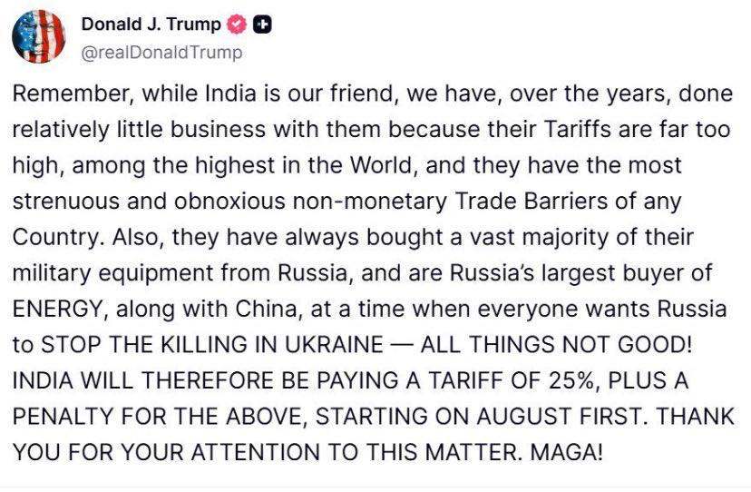 ट्रम्प ने सोशल मीडिया प्लेटफॉर्म एक्स पर लिखा, "याद रखें, जबकि भारत हमारा दोस्त है, हमने वर्षों से उनके साथ बहुत कम व्यापार किया है क्योंकि उनके टैरिफ़ बहुत ज़्यादा हैं, जो दुनिया में सबसे ज़्यादा हैं, और उनके पास किसी भी देश के मुकाबले सबसे कठोर और घृणित गैर-मौद्रिक व्यापार बाधाएं हैं." उन्होंने आगे जोड़ा, "साथ ही, उन्होंने हमेशा अपने सैन्य उपकरणों का विशाल बहुमत रूस से खरीदा है, और चीन के साथ रूस की ऊर्जा के सबसे बड़े खरीदार हैं, ऐसे समय में जब हर कोई चाहता है कि रूस यूक्रेन में हत्याएं बंद करे — ये सभी बातें अच्छी नहीं हैं!".