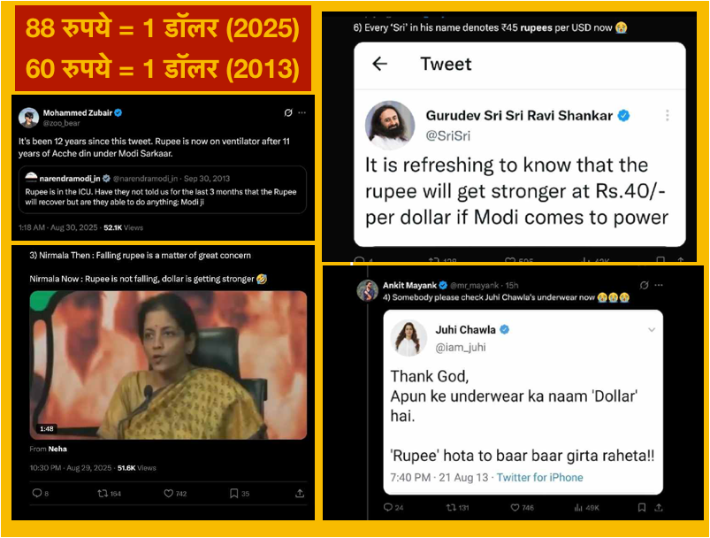 दंडात्मक अमेरिकी टैरिफ़ की चिंताओं के बीच भारतीय रुपया शुक्रवार को ऐतिहासिक रूप से निचले स्तर पर गिर गया और पहली बार 88 प्रति डॉलर के स्तर को पार कर गया. जहाँ बाज़ारों में घबराहट का माहौल था, वहीं इंटरनेट पर लोगों ने पुराने ट्वीट्स और वायरल वीडियो निकालकर उन राजनेताओं, मशहूर हस्तियों और गुरुओं का मज़ाक उड़ाया, जो कभी गिरते रुपये की आलोचना करते थे और अब चुप हैं.